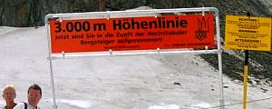 Beim Überschreiten der Höhenlinie von 3000m wird man in die Zunft der Hochstubaier Bersteiger aufgenommen. Das Achtung-schild warnt davo den markierten Weg zu verlassen, da die gefürchteten Gletscherspalten lebensgefärlich sein können